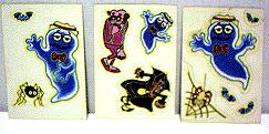 - Description: In pack thin plastic glow figures of the monsters from torso up with sticker backs.